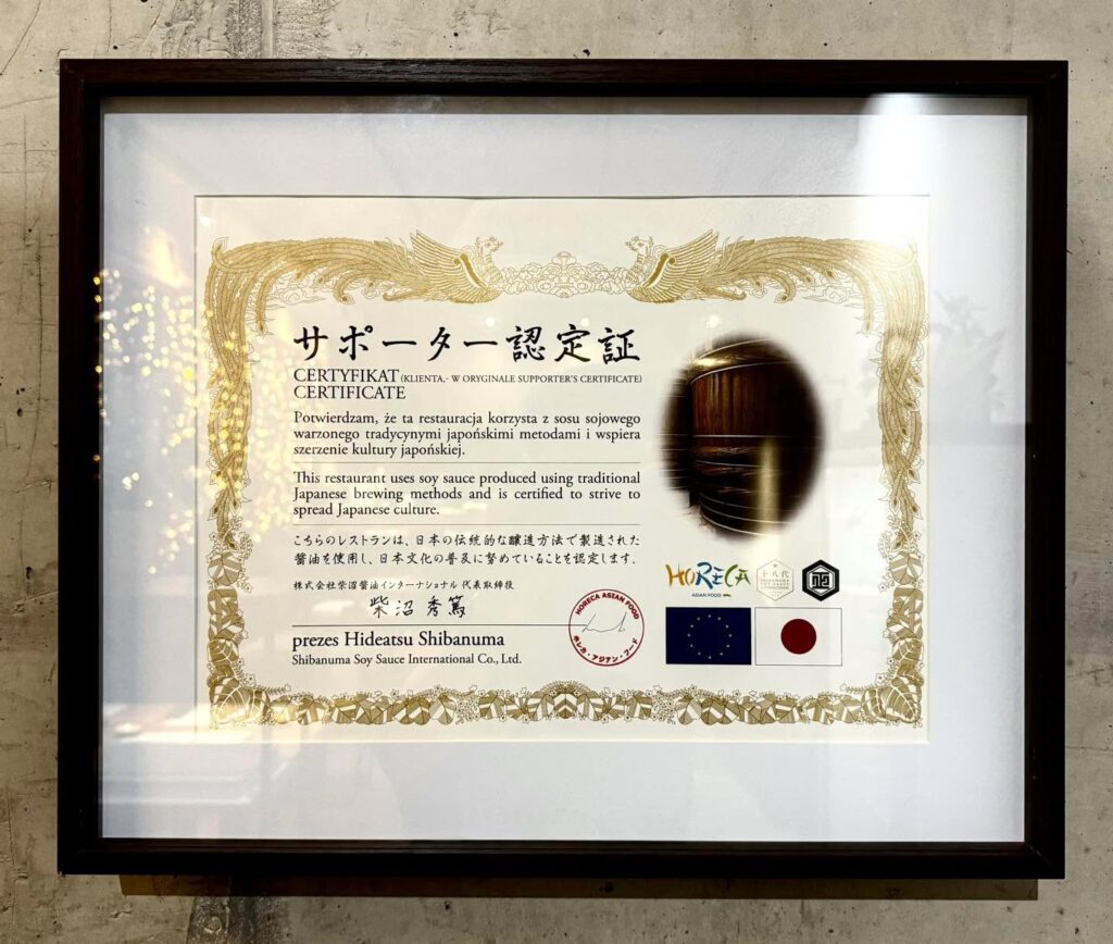 W Kohana Sushi korzystamy z sosu sojowego Shibanuma, warzonego w Japonii nieprzerwanie od 1688 roku. Jego wyjątkowy smak docenił już Shogunat Tokugawa, a dziś certyfikat autentyczności potwierdza, że nadal pozostaje wierny wielowiekowej tradycji.